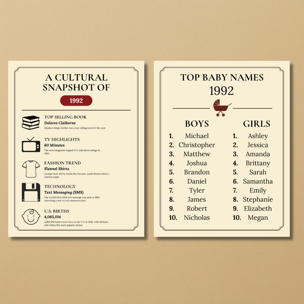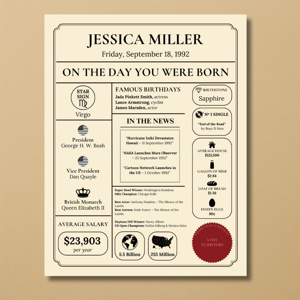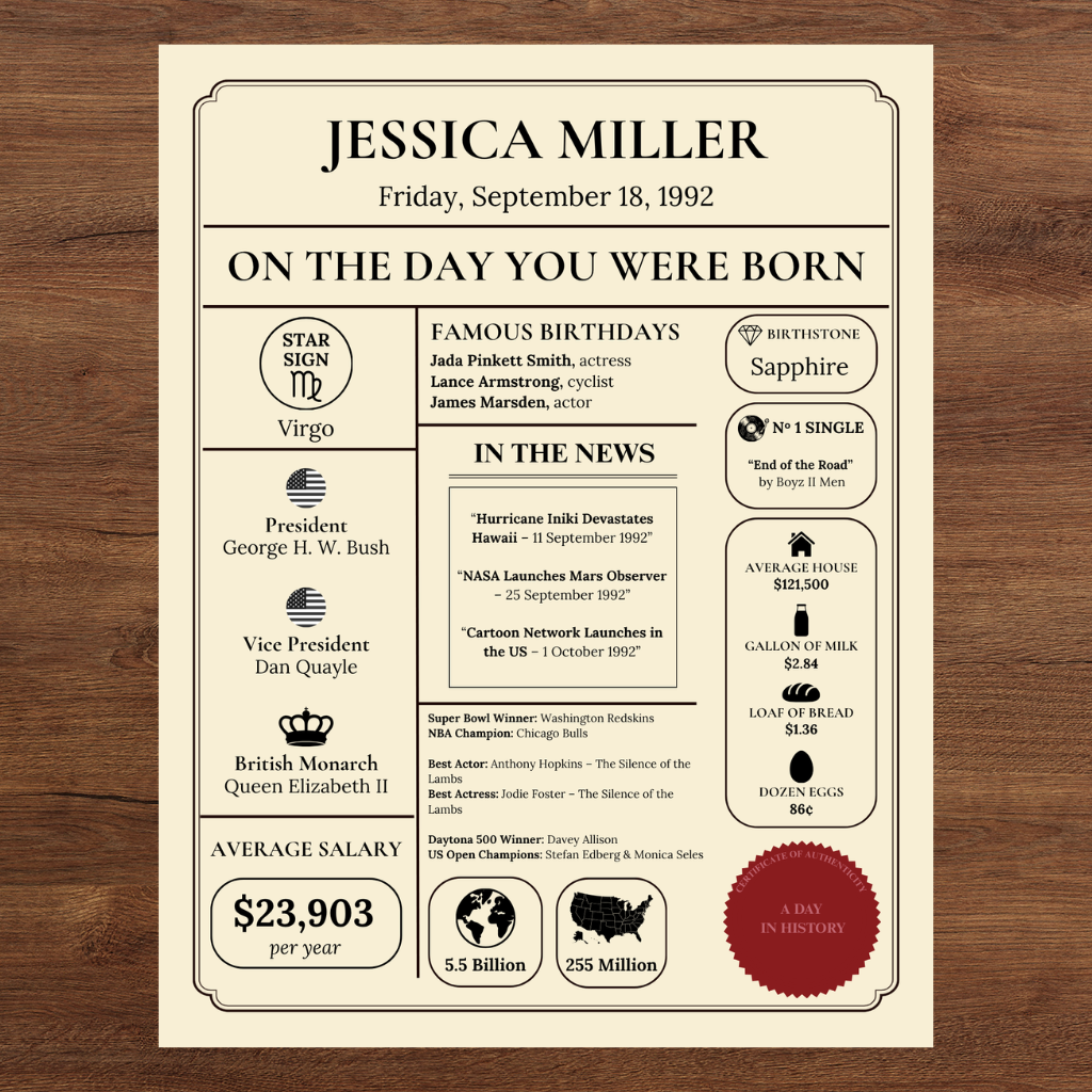 From house prices to who topped the charts — this page captures your exact birthday in stunning detail. It’s the one you'll frame.
