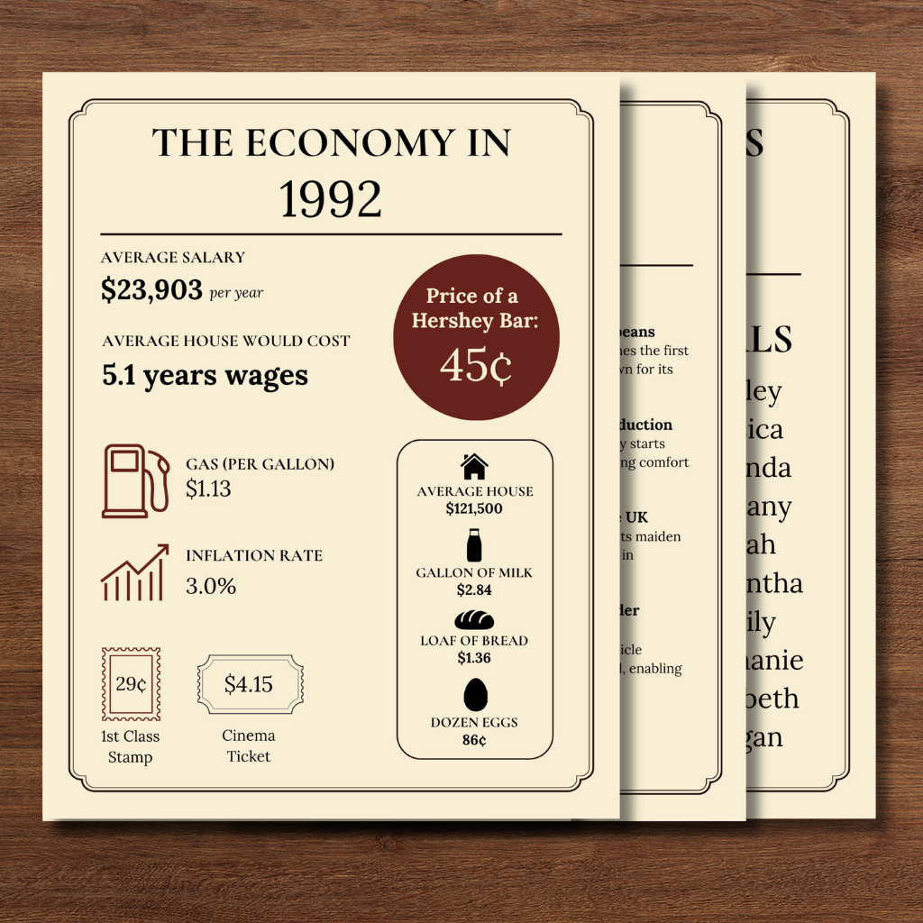 Your birthdate, brought to life with real headlines, prices, events and pop culture — printed on parchment-style paper and housed in a premium presentation folder.